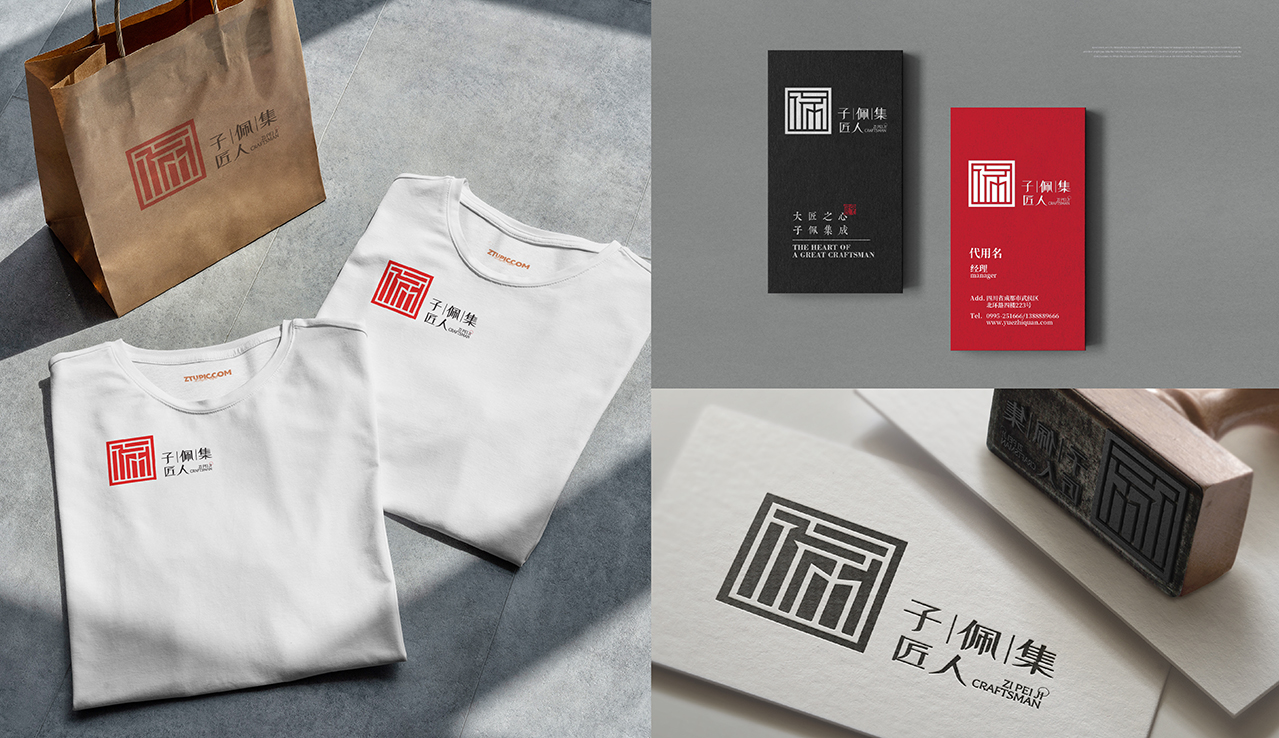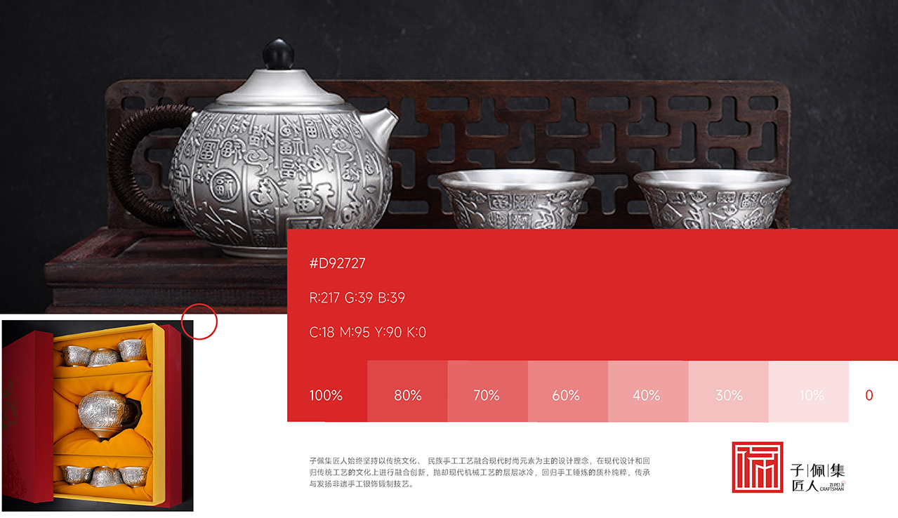 此方案主要以品牌名前两字子佩为主做印章类的字体设计,子佩代表品牌,印章代表传承银文化精神,在字体中融入匠心以及工具锤子元素,体现行业属性,表现匠人精神。