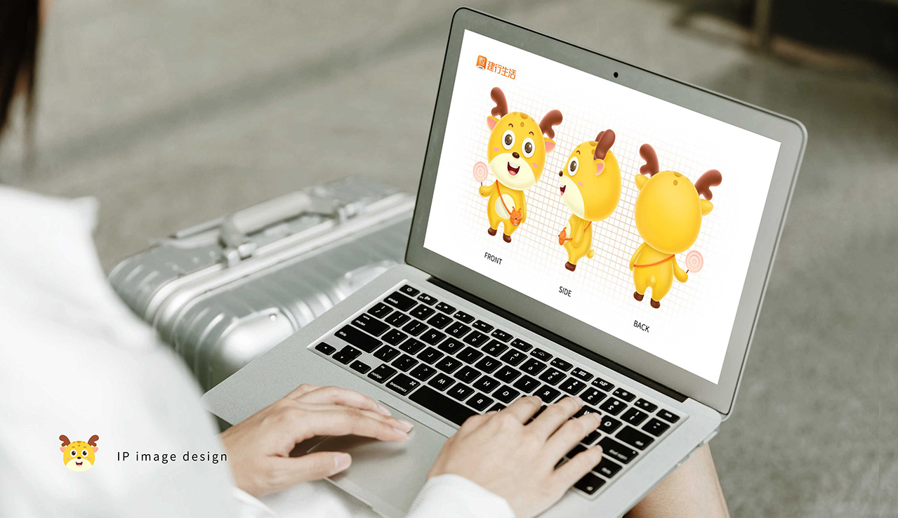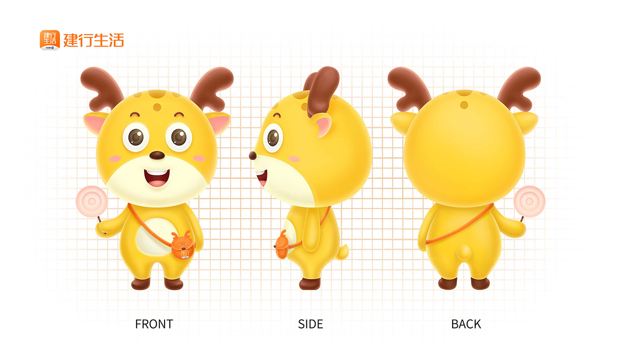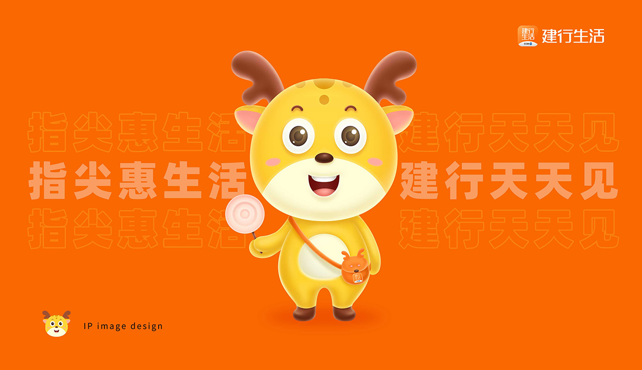 定位:享受生活、乐观积极、爱吃爱玩;创作说明:主要以梅花鹿为IP拟人原型,皮肤为橙黄色。头上有着明显的简化的鹿角,梅花鹿的圆形斑点特征与LOGO的辅助图形相结合做为脸部点缀。手拿棒棒糖、身带小鹿挎包,体型圆润可爱,体现了IP活力乐观、享受