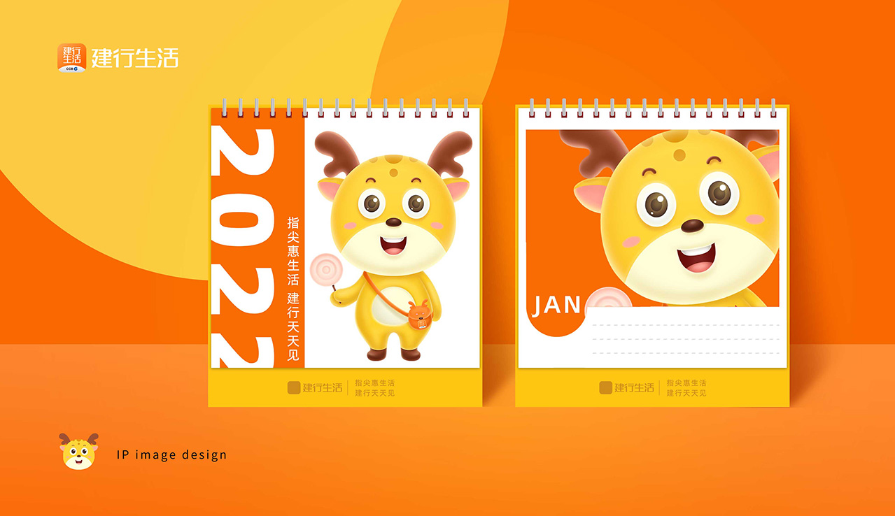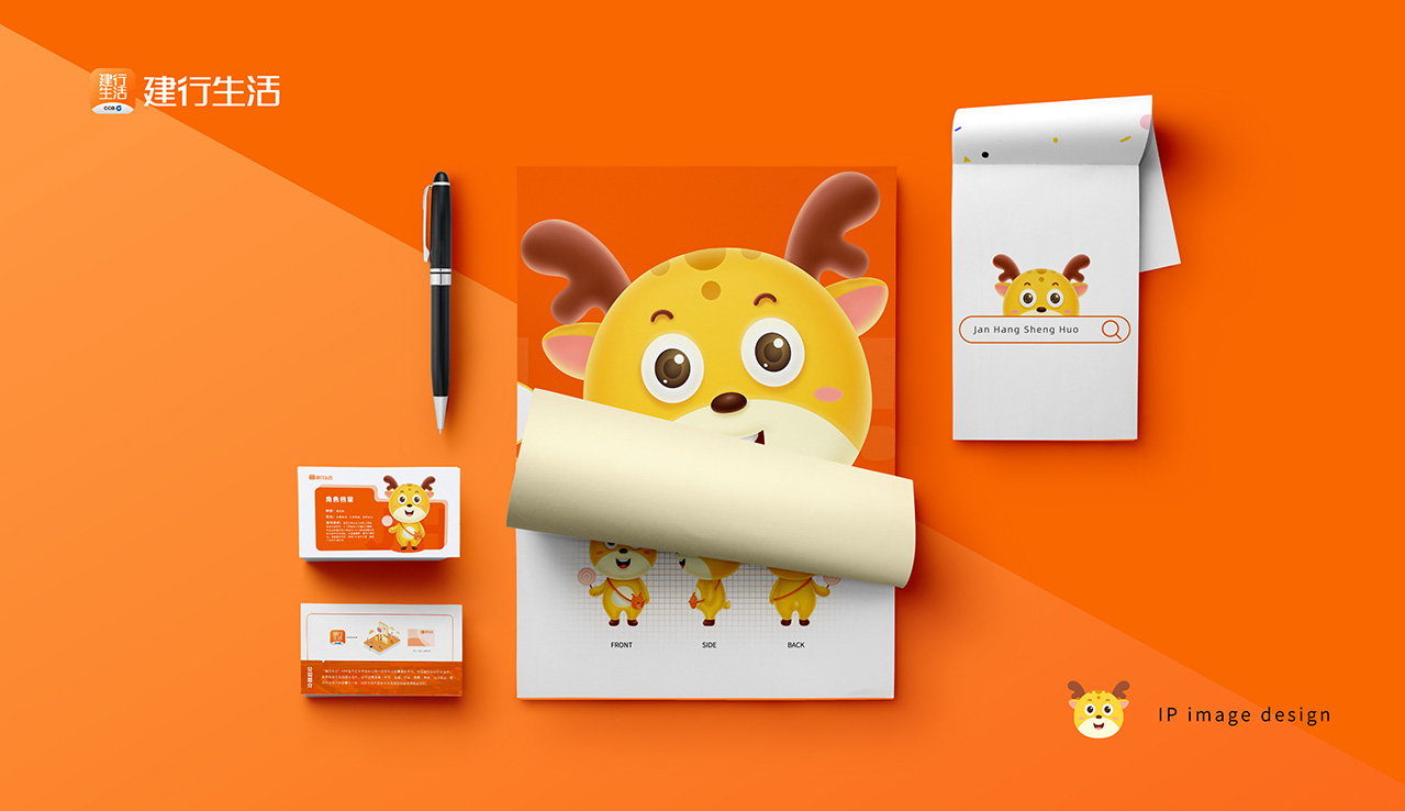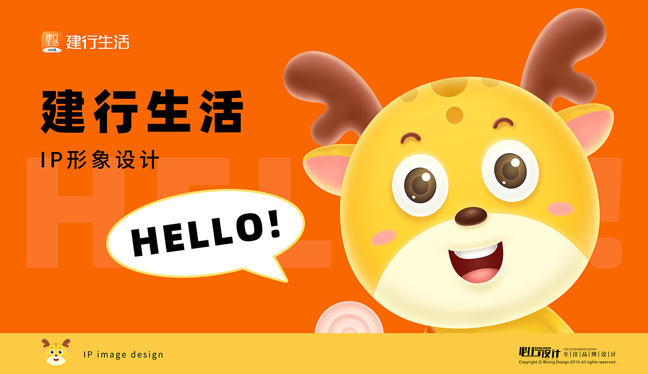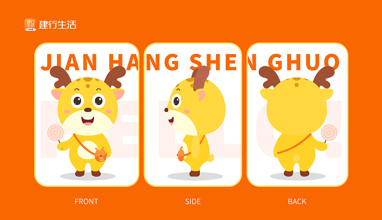 定位:享受生活、乐观积极、爱吃爱玩;创作说明:主要以梅花鹿为IP拟人原型,皮肤为橙黄色。头上有着明显的简化的鹿角,梅花鹿的圆形斑点特征与LOGO的辅助图形相结合做为脸部点缀。手拿棒棒糖、身带小鹿挎包,体型圆润可爱,体现了IP活力乐观、享受